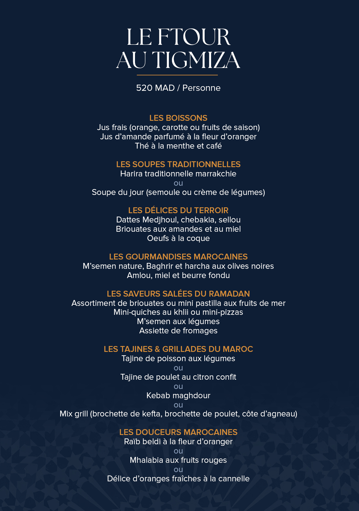 À l’occasion du mois du Ramadan, savourez un ftour gourmand et convivial aux délicieuses saveurs du Maroc dans le cadre authentique du restaurant marocain Lallati de l’hôtel Tigmiza. Le repas sera accompagné d’une ambiance musicale live.