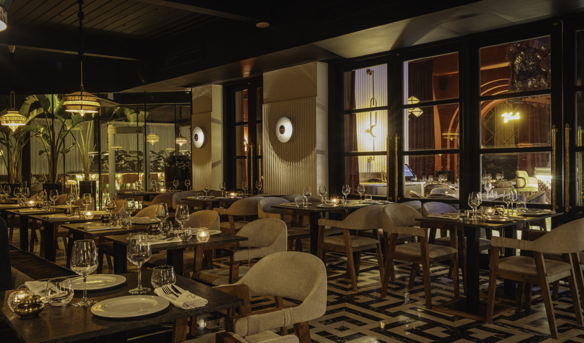 The venue transitions from an elegant dinner setting to a lively lounge atmosphere, perfect for dining, enjoying a drink, and experiencing Marrakech’s nightlife.