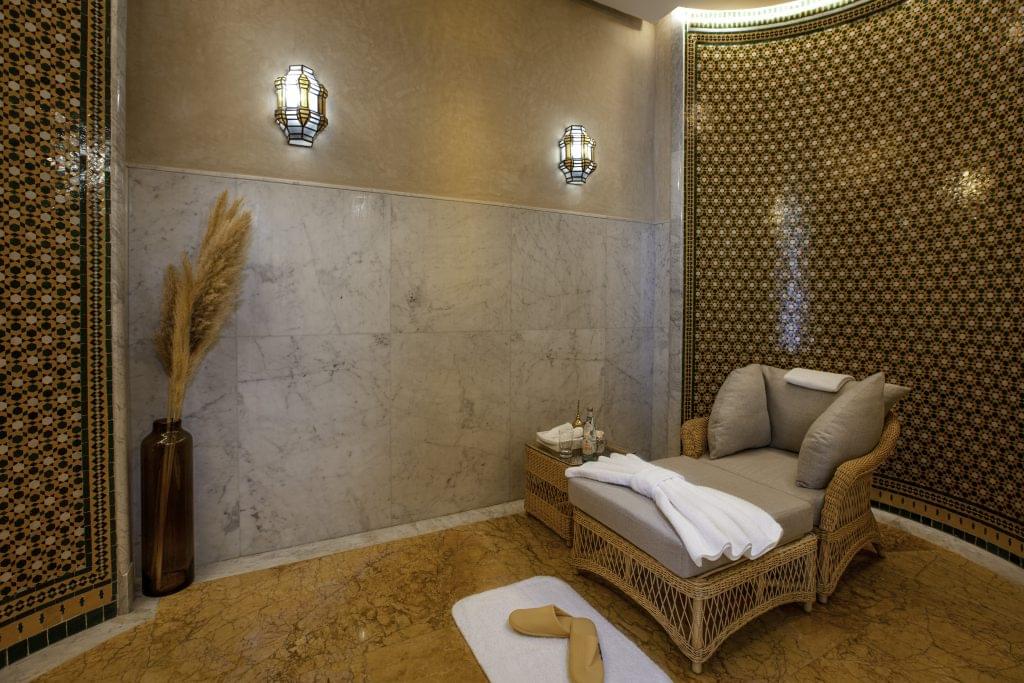 El espacio consta de siete salas de tratamiento, dos salas de tratamiento ayurvédico y dos hammams tradicionales marroquíes. El edificio está salpicado de motivos tradicionales marroquíes, deconstruidos y luego rediseñados con un toque moderno.