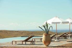 The White Camel, situé dans le désert d’Agafay. La piscine du White Camel bénéficie d’une vue exceptionnelle sur les
